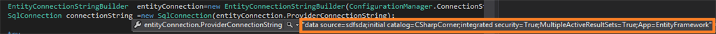 - EntityConnectionStringBuilder entityConnection = new EntityConnectionStringBuilder(ConfigurationManager.ConnectionStrings["CSharpCornerEntities"].ConnectionString);