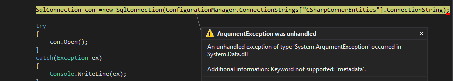 - SqlConnection con = new SqlConnection(ConfigurationManager.ConnectionStrings["CSharpCornerEntities"].ConnectionString);