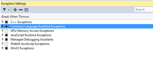 In the Exception Settings, go to Common Language Runtime.
