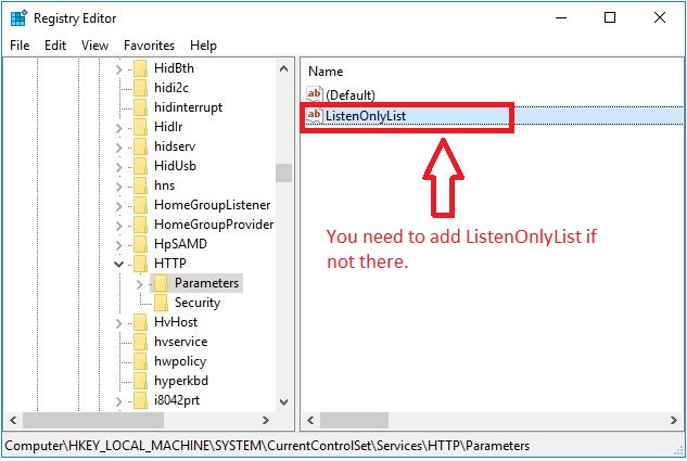 Once IP address is successfully added, you can see ListenOnlyList added in the registry with correct value.