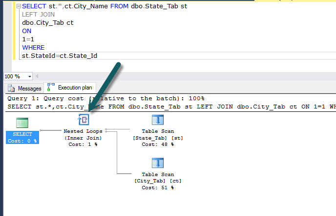 We can see that both the queries use the left outer join but the second query implements the inner join, instead of outer join, because for "On condition", we define the 1=1, which will be always true, so the query optimizer converts the left outer join to cross join due to the "Where condition". This cross join will convert into the inner join.