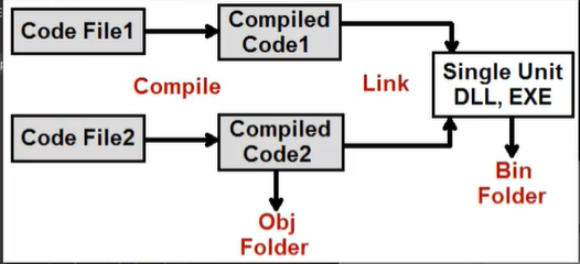 The second process is when individually compiled code unit is linked to a single unit that can be assembled as .exe or dll.