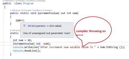 When we use the out keyword, we need to initialize in called function, otherwise, the compiler will have an issue.Please check the below issue.