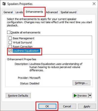 - Switch to the Enhancements tab and choose the Loudness Equalization. Click OK