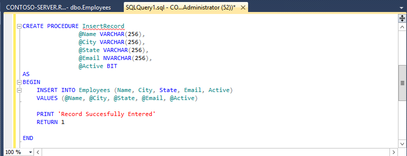This Example show you how to insert an record in table using simple stored procedure using T-SQL.