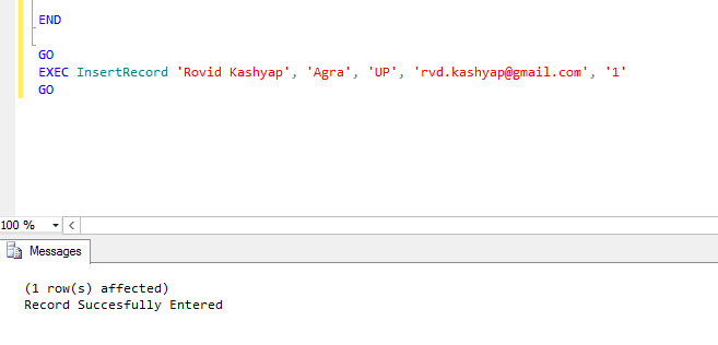 Now Run the Stored procedure you will get an Message 'Record Successfully Entered".