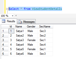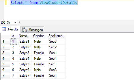 - Insert into ViewStudentDetails values(7, 'Satya7', 'Female', 'sec5')