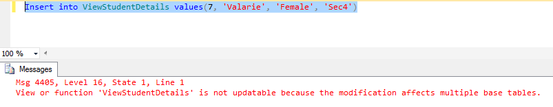 Let's try to insert a row into the View, ViewStudentDetails, by executing the following query. An error will be raised showing "View or function ViewStudentDetails is not updatable because the modification affects multiple base tables".