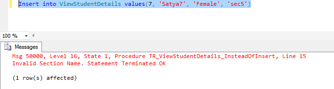Here, we are getting one error message as we used in Raiserror() function using Instead of insert trigger.