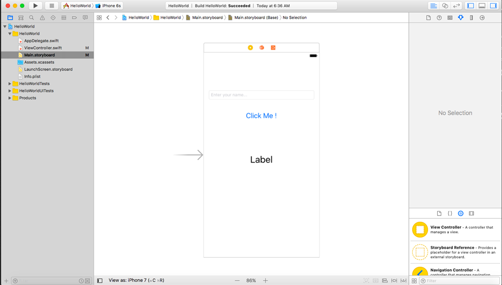 Click Main.storyboard in the left tab. An iOS device demo will appear. Drag and drop a Text Field, Label and a button, as shown below at bottom right.