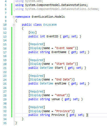 I created the Location Table, notice in this table I have used using System.ComponentModel.DataAnnotation and a new Library Using System.ComponentModel.DataAnnotation.Schema. The .Schema allows me to declare a foreign key, in this case, the FK is EventID.