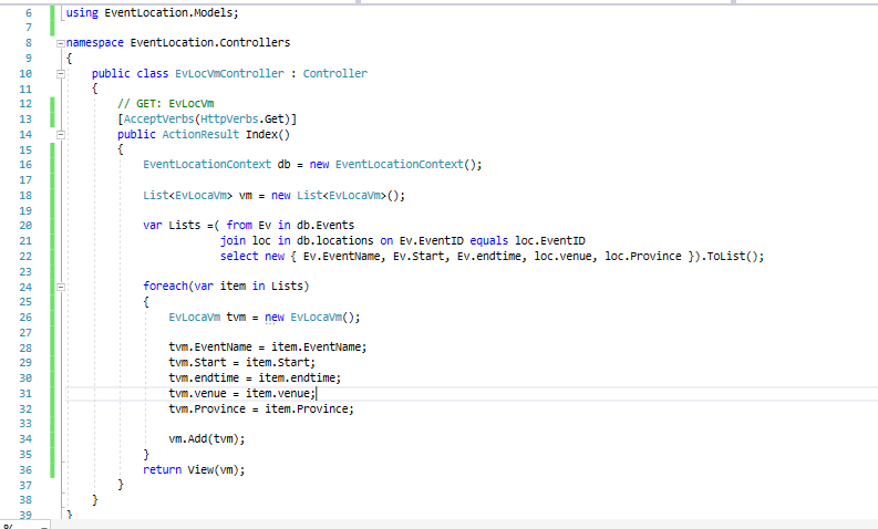 Here is the “fun” part, for the program to get data from both the tables and just display specific items the tables need to be Joined. Hence, we write a query linking the PK from the Events Table to the FK in the Location Table. Afterward is a free flow, we create a foreach loop and take initialize all the values we want to display from those tables and equate it to the items selected from the DB, we add it to the list and return the list.