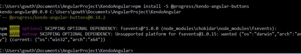 To use the Kendo button for Angular 2 we need to install the Kendo button package, and pass the below command to install it.