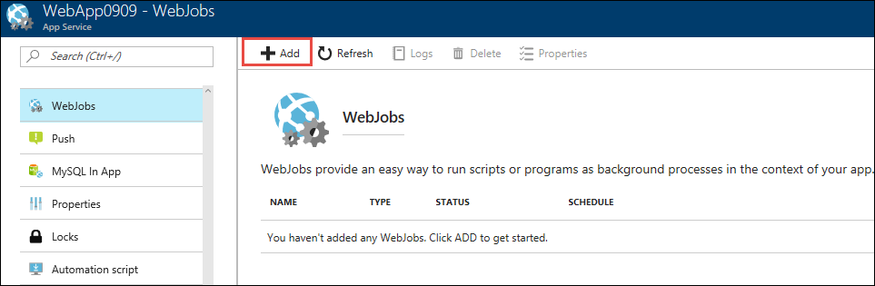 - In the WebJobs page, select Add.