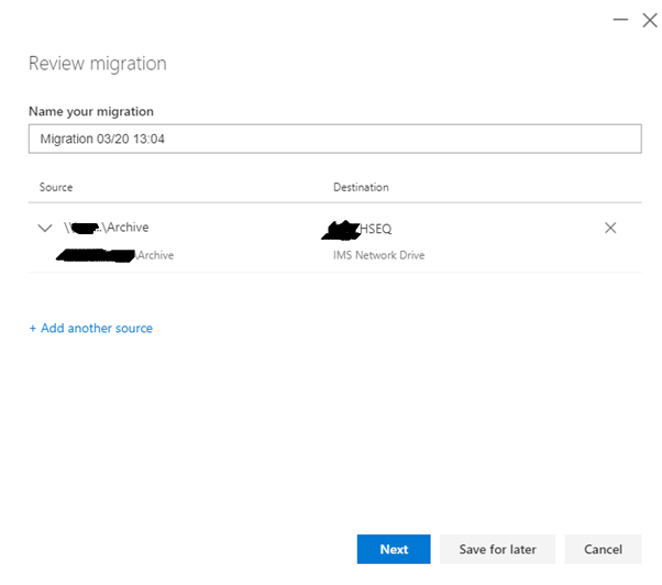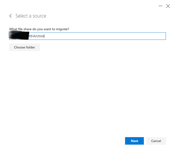After clicking Start new migration, it asks for content (Source), I am using File Share.