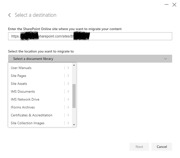 Select document library, or click the arrow to migrate data in a specific folder.