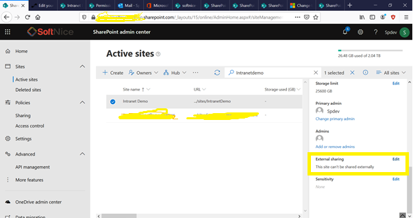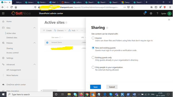 2. Select your site under active sites for Editing and click the sharing option, as shown in the below snapshot.