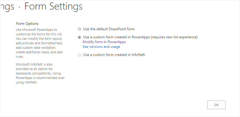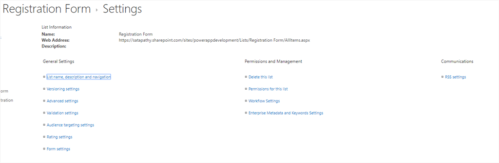 - Inside the List Settings down on the left-hand side of the General Settings click on Form Settings.
