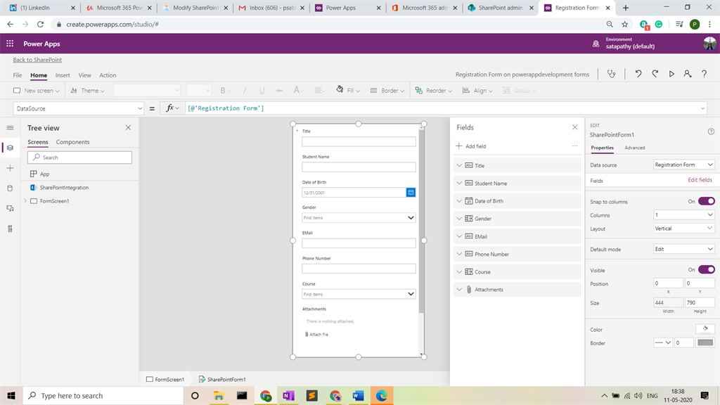 On the left pane, the main object is Share Point Form, under the Form, there are several objects which are displayed on the right pane of the center. In the fields you can edit, re-order and also delete if required.