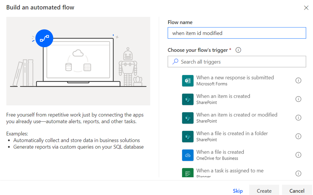 But MS Flow did not provide an automated flow that only triggers when an item is updated. So when you have a requirement to trigger a flow only when an item is updated that should not trigger when an item is created, you need to use it when an item is created or modified through the automated flow template.