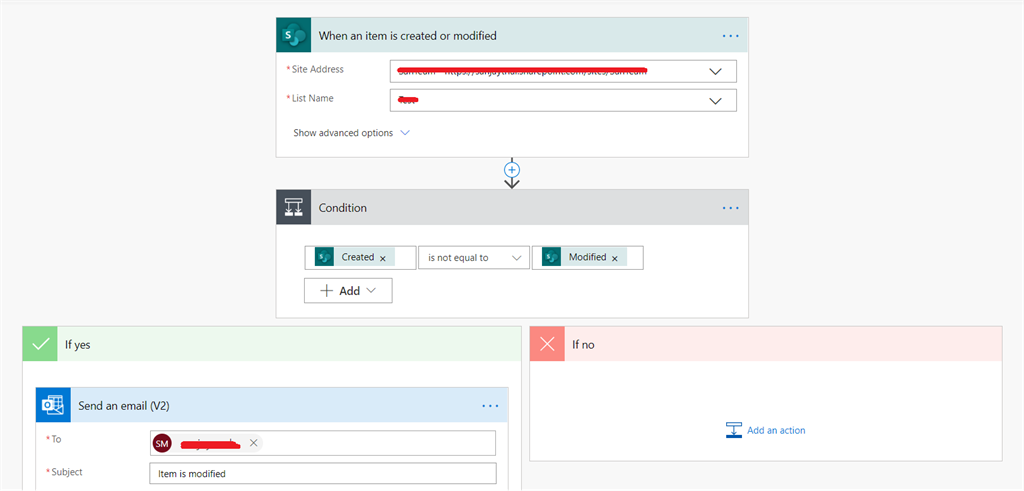 For this, you can add the condition control for if the item’s created DateTime is not equal to the modified DateTime. In the true section, you can add the action which you want to perform when an item is updated, as shown in the below screenshot.