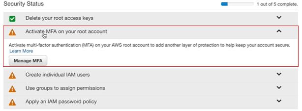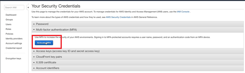 Click on the Manage MFA button and click on the continue security credentials button then we can see Activate MFA option. Please check the below figure.