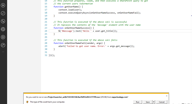 Once you click on the option, an exe will be downloaded and then click the Run option. Now, you will be able to see your APP in the Visual Studio 2013 for the further enhancements.
