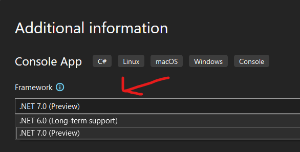 On the Additional information Tab, there is drop-down “Framework”, check whether you can see the “.NET 7.0 (Preview)”, if yes, Select and click on “Create”.