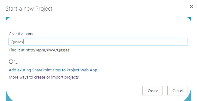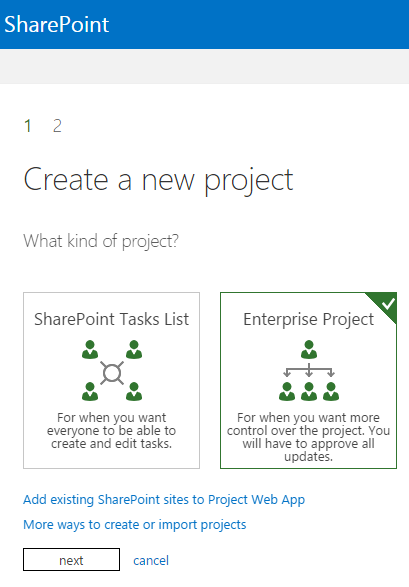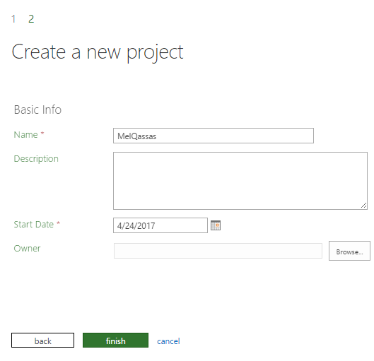 In Project Server 2016, you can easily create a new project through a wizard consisting two steps.