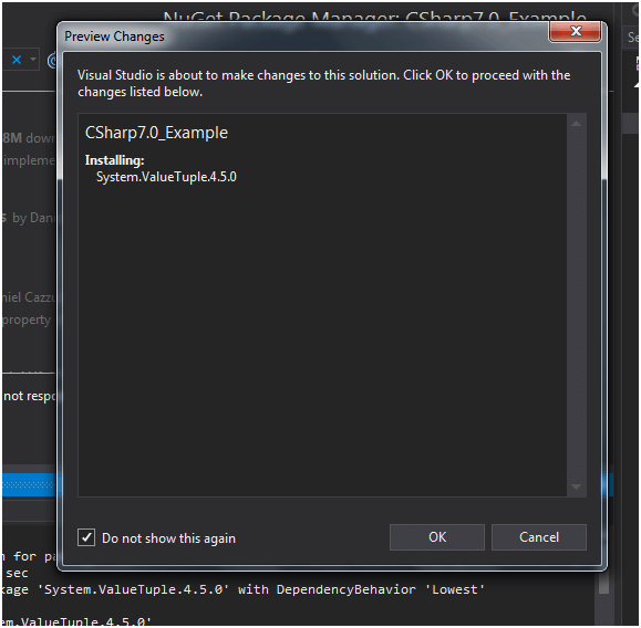 In C# 7.0, you can try this feature right now in Visual Studio 15. However, the ValueTuple<T1, T2> type is not (yet) part of the .NET Framework; to get this example to work, you’ll need to reference the System.ValueTuple NuGet package.