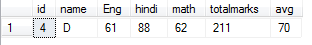 - insert into student(id,name,Eng,hindi,math)values(2,'B',45,33,41)