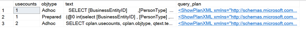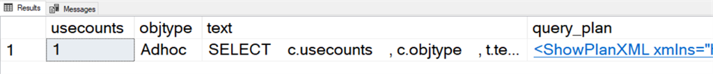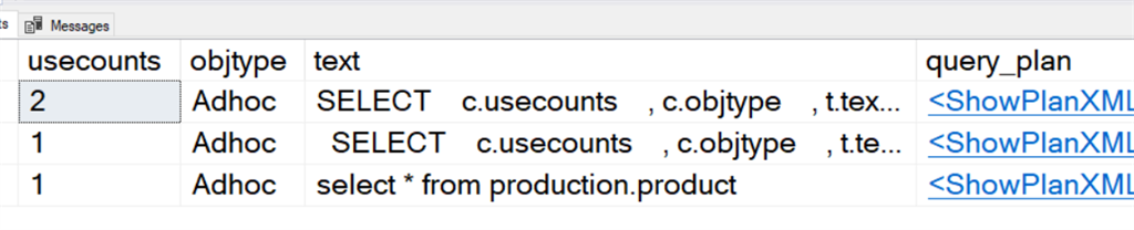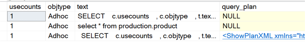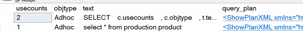 Now run the product table query. Once you do you will see something like below. As you can see, not only is there a record for our query, but also a plan as well. This is because the Optimize for Ad Hoc workloads is turned off.