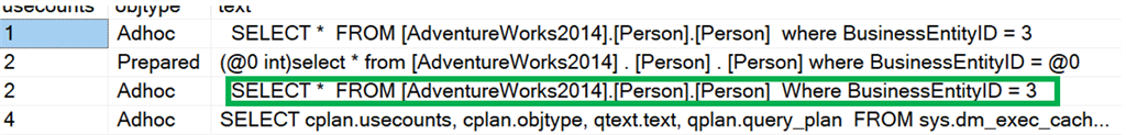 Below is the result set from the above query. With this, I can review the query and the execution plan for the Ad Hoc query.