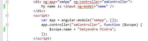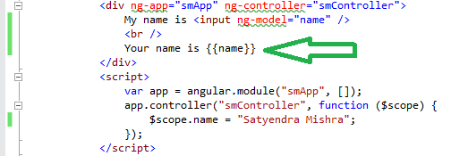 We created a reference to AngularJS Application in JavaScript and set AngularJS variable "name" with the help of the controller to "Satyendra Mishra". This value is ultimately set as a text box value.