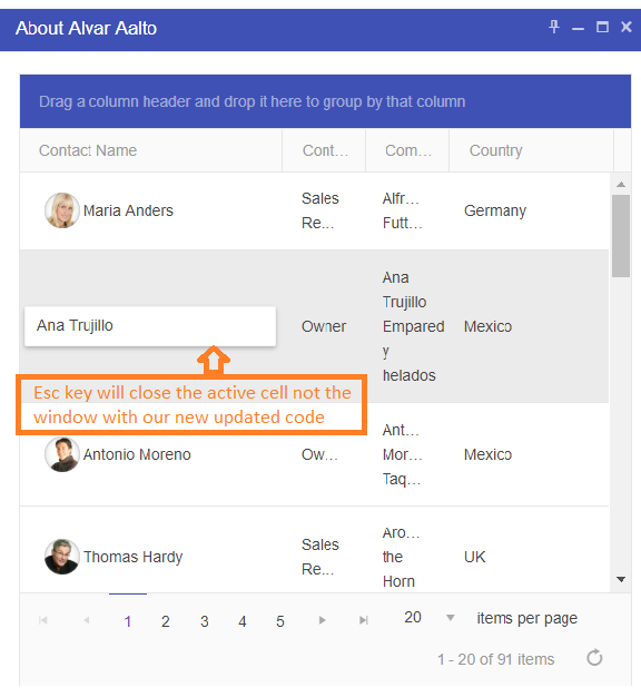 Using Esc key to close the kendo window is a default functionality of it, but in some scenario if you have editable kendo grid in kendo window then there will be conflict while the user uses the Esc key, because the same Esc key will close the kendo grid cell if it is in editable mode, but by default it will close the entire window, now we need to prevent this default functionality of kendo window.