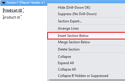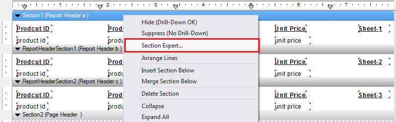 Now, press mouse right click on Section 1 (Report Header a), Section 2 (Report Header b), Section 3 (Report Header c) and select Section Expert.
