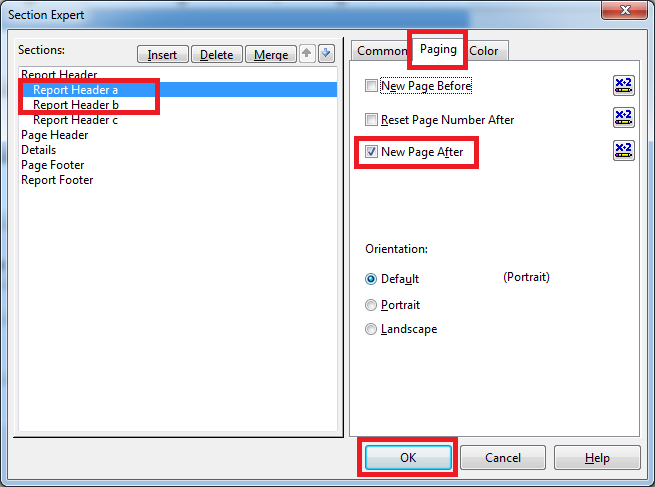 Check Checkbox New page after in paging tab. for Report Header a and Report Header b only and Click OK.