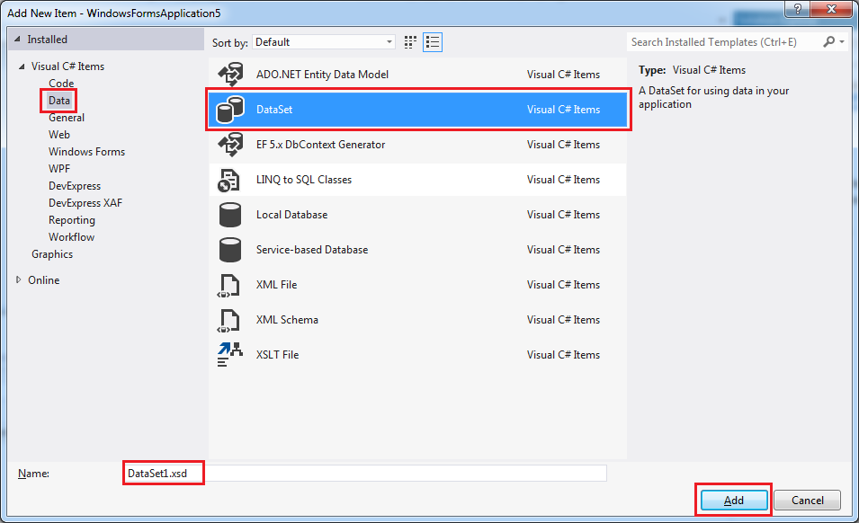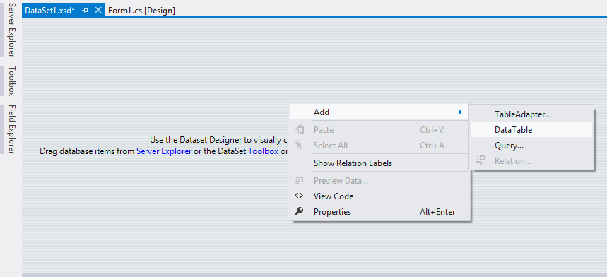 To add Datatable in dataset, follow this screen and right click on dataset. Select Add >> Datatabe and add columns in it as like in your table.