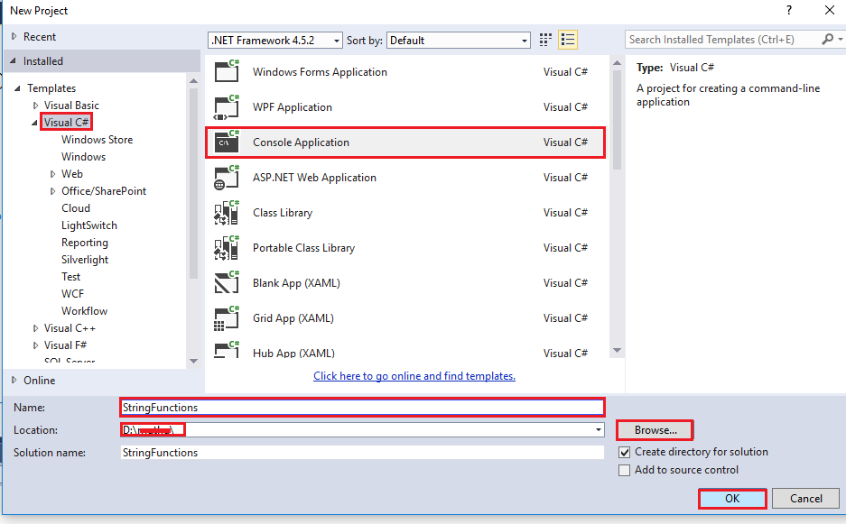 Next, to choose the Visual C# -> Console application, then give the name of your application in the New Project window, then browse the location for your project. After that, press the OK button to create your console application.