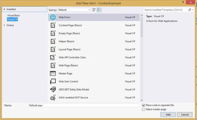Add a new Web Form named “Default.aspx”, in this page it will accept user id and password as well as create cookies.