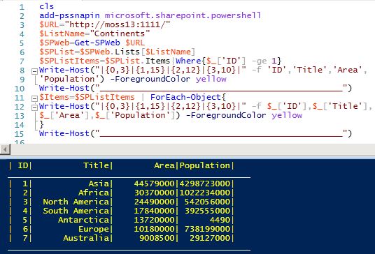 - $_['Area'], $_['Population']) - ForegroundColor yellow