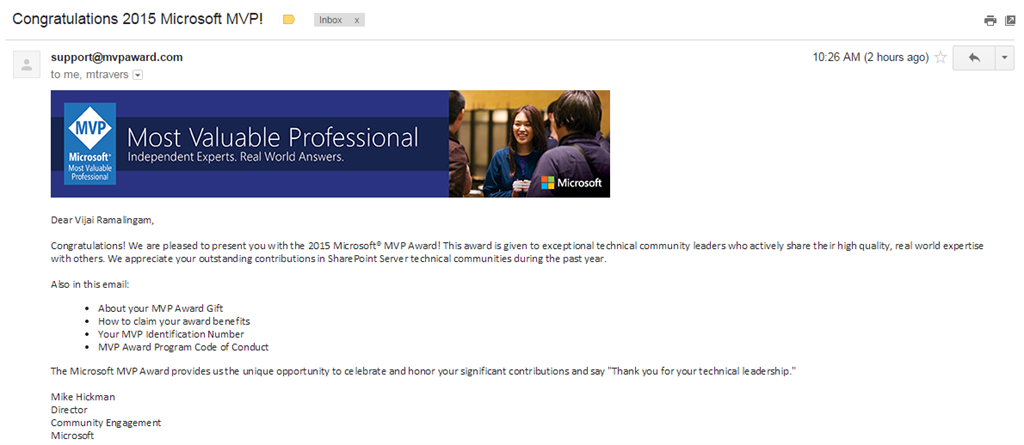 New Year 2015 started with a great gift from Microsoft. I received an email from Microsoft saying that I have been awarded as Microsoft MVP Award 2015 for SharePoint Server. Third time in a row!!