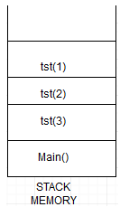 Main calls Tst with parameter 3, and the controls go to method Tst, hence the Main method is not finished yet, so it gets saved into stack memory.