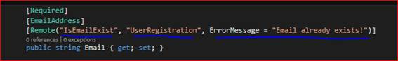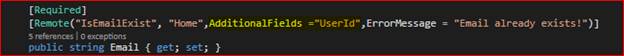 - [Remote("IsEmailExist", "UserRegistration", ErrorMessage = "Email already exists!")]