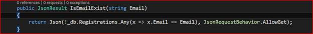 As soon as the user enters an Email in the field; the control will come over to the action and in a parameter, it will get the details of an Email Id entered by the user. Afterwards, it will check in the database, whether the E-mail exists or not, as per the condition and it will return the Boolean value.