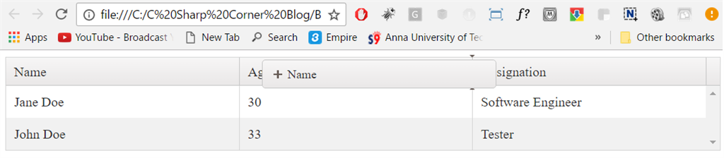 From the code given above, you can notice the reorderColumn function consists of the two parameters, which says change the age column position from 1 to 2, as show below.