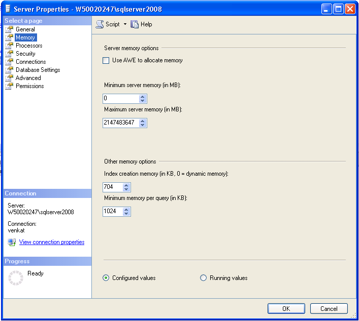 1. Configured values - Modified value and it's effectively only if you click OK button (Some options may be after server restart)