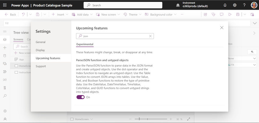 Note: Before we start the actual app development, turn on the experimental feature ParseJSON function and untyped objects.