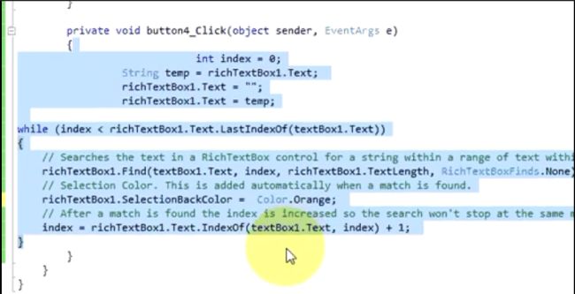 richTextBox1.text.Find(textBox1.Text , index , richTextBox1.TextLength, RichTextBoxFinds.None);