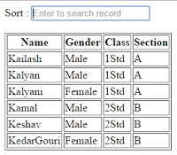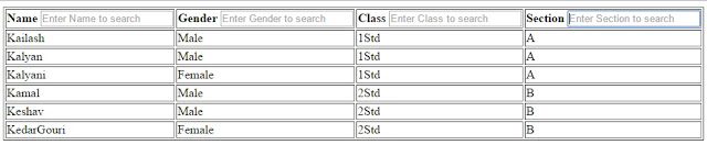 This example uses filter in HTML or client side. It displays a list of students in a table and applies filter for searching students. This example demonstrates how to achieve full text search (searches in all column) and column wise search. See the below code snippet for more details.